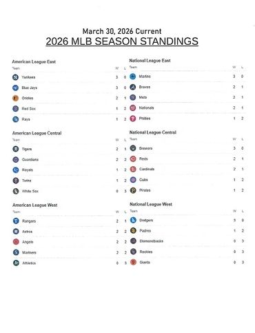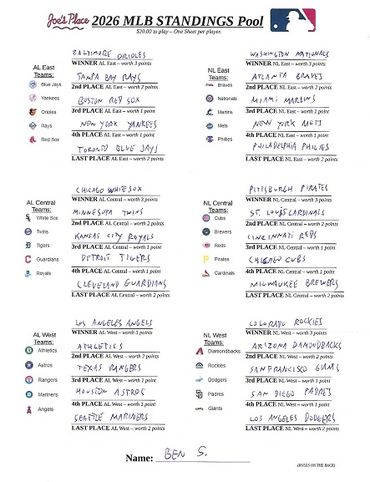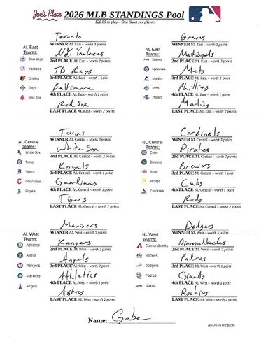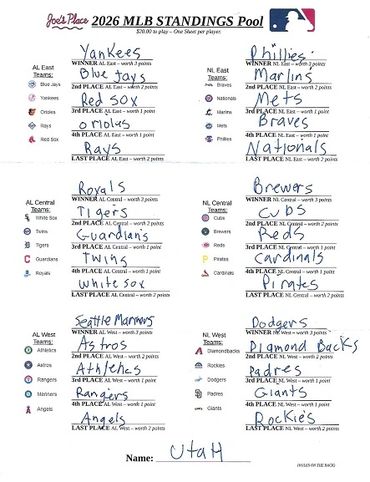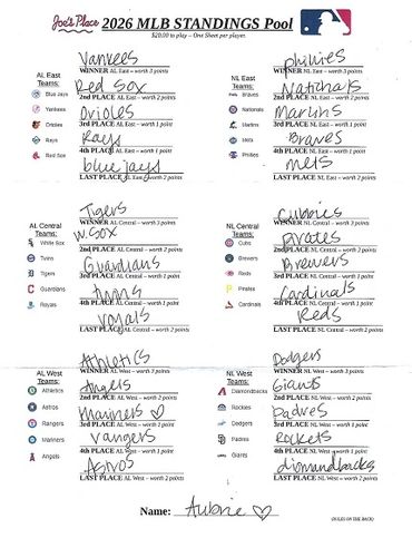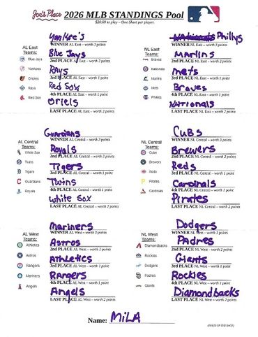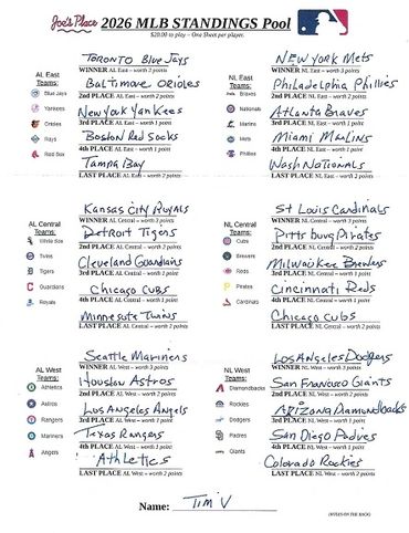This MLB STANDINGS POOL is based on points tallied and given for correct winning picks of the positions at the end of the Final 2026 Major League Baseball Regular Season Standings as followed: