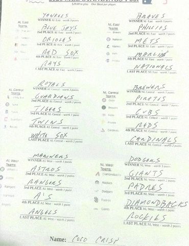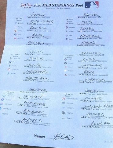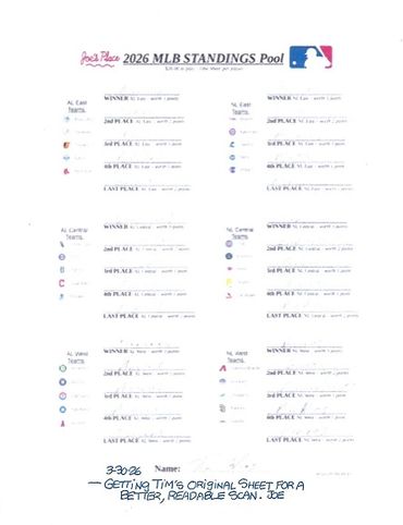 Alright. I collected 9 Sheets before the deadline. So, you've got 9 Players in this season's Major League Baseball Standings Pool. At $20.00 a Sheet, that gives you a Pot of $180.00. Which is $140.00 for First Place and $40.00 for Second Place.