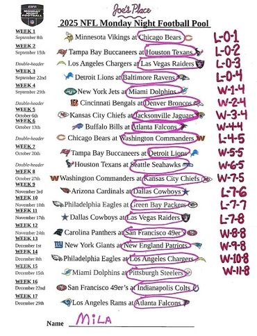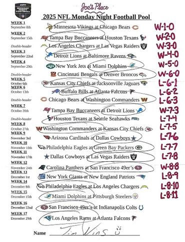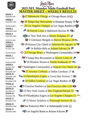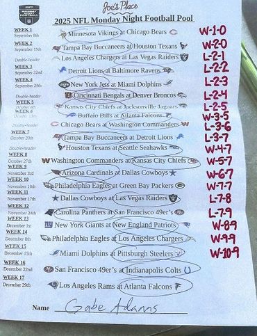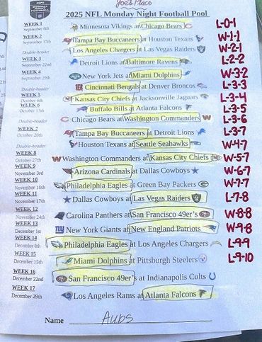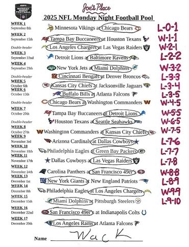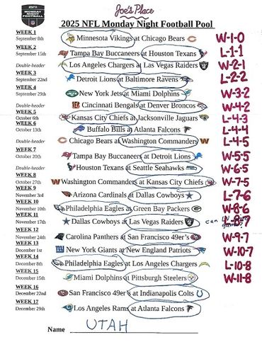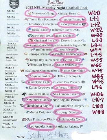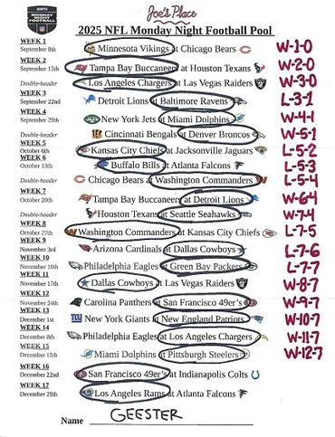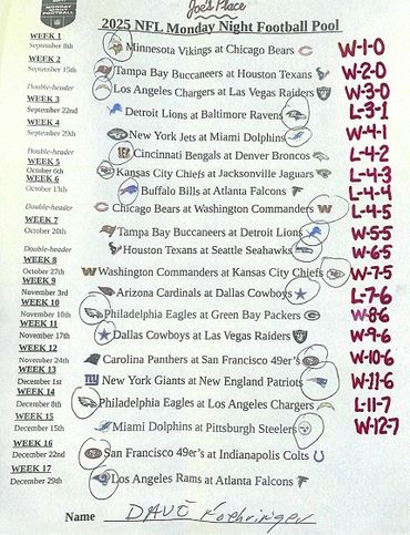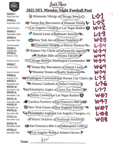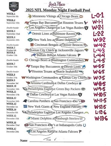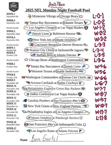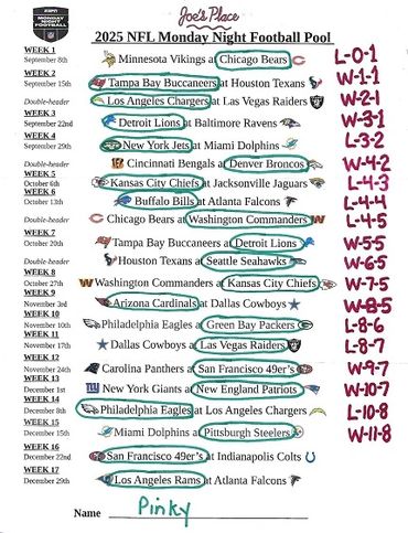 1ST PLACE: Person with the Best W-L Record after week 17 Wins the Pot* (*Pot amount - less $120 to cover 2ND PLACE and LAST PLACE pay-outs listed below.)
