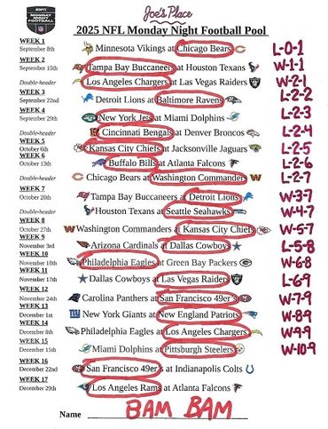 In the unlikely event that a Monday Night Game is rescheduled, switched or moved by the NFL, these are the 21 games from which the W-L Record will be calculated after the Week 17 Monday Night Game.