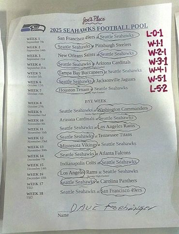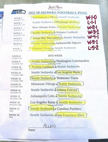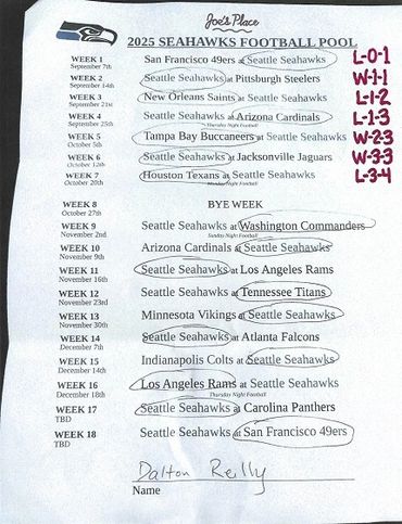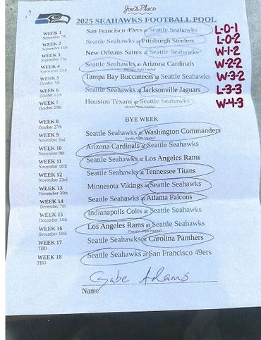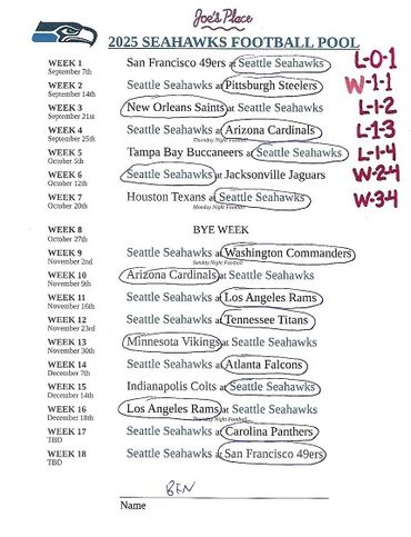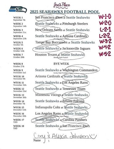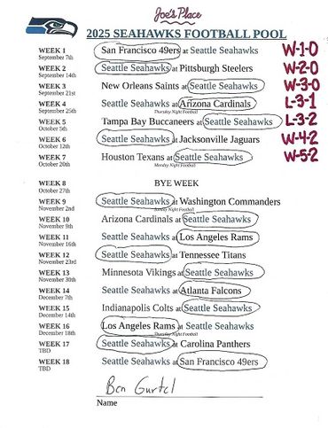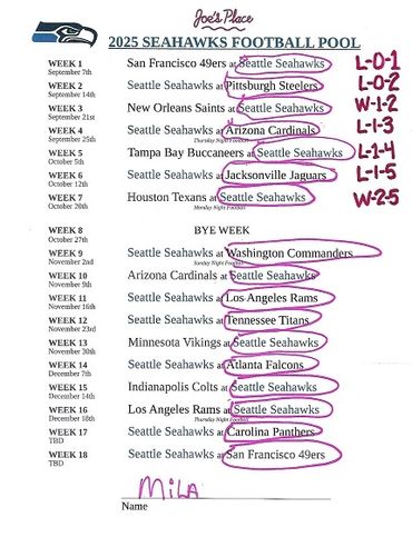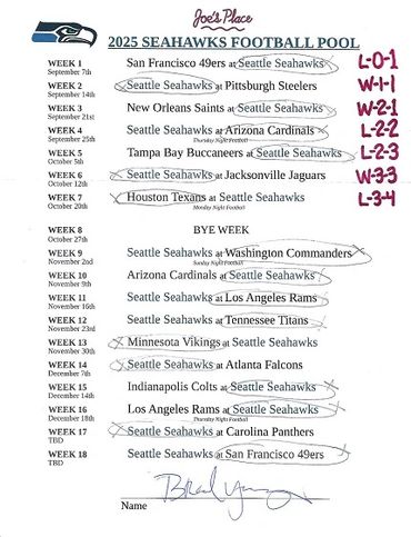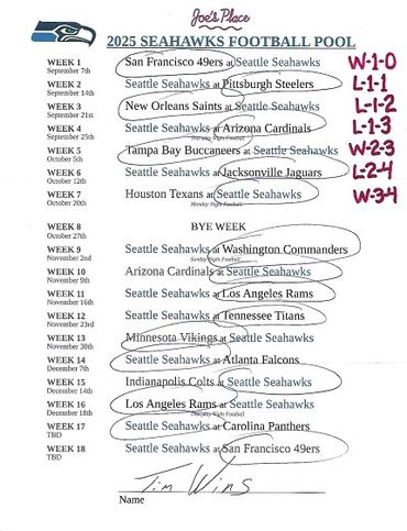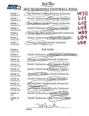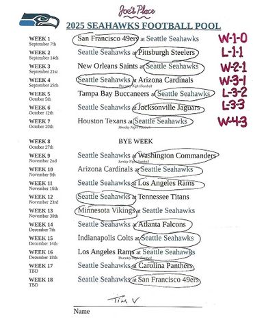 After Week 7 where the Seahawks beat the Texans, 27-19, below is your updated Standings and copy of everyone's updated Sheets.