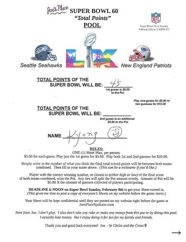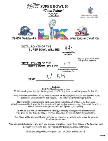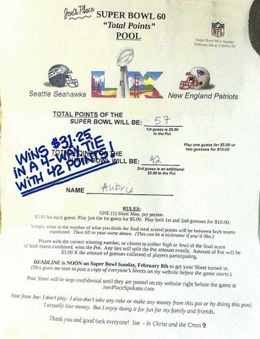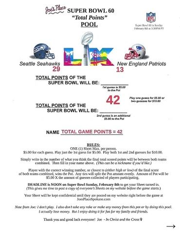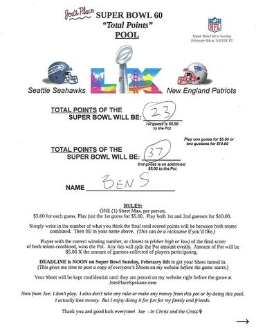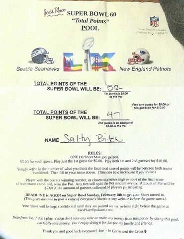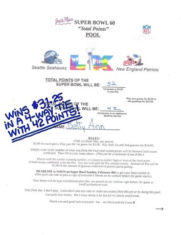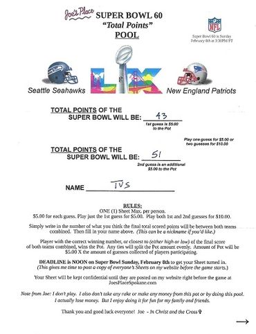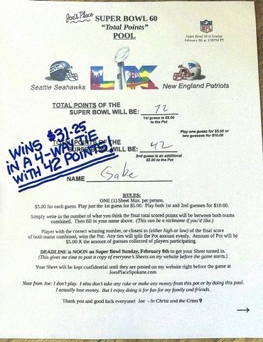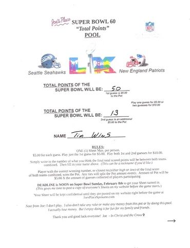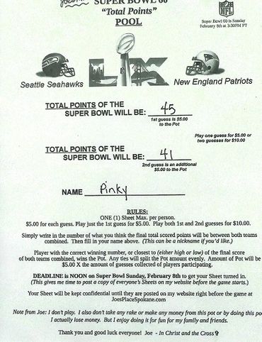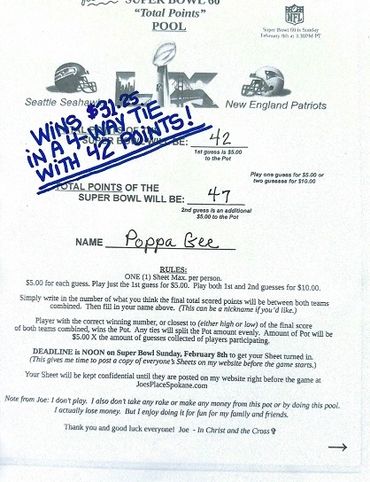 Remember, I collected 25 Guesses before the deadline at $5.00 a Guess, which gave you a Pot of $125.00. There's no second, or last place in this Pool, like there was in the Monday and Thursday Night Football Pools. Only a first place, being the Player guessing or being closest to guessing the Total Points of the Super Bowl, winning the Pot. And any ties, splitting the Pot evenly.